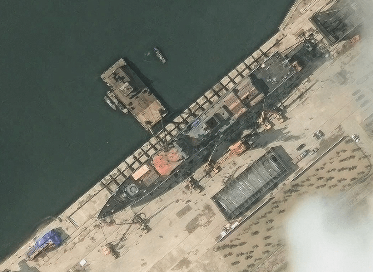 Leader Kim was present for the launch and “made a stern assessment that this was a serious accident that could not have happened, could not be tolerated, and was a criminal act caused by pure carelessness, irresponsibility and unscientific empiricism,” KCNA reported. No photos were released from the scene of the accident but satellite images show the ship lying on its side in the water. No information about casualties or injuries had been released at this time. The accompanying image here shows the ship prior to the attempted launch.